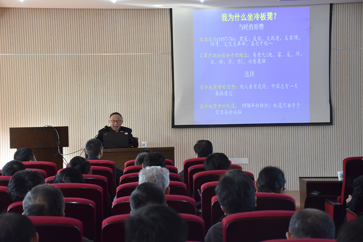殷鸿福院士以《我的教师人生》为题,从三个方面讲述了他从教60多年的经历和感想:1、选择人生道路;2、在育才中育人;3、风气造团队。选择人生道路中,他谈到了人生的3次重要选择:少年求学为什么选择地学,怎么选择考大学的志愿——以国家需求为重要前提;在青壮年时期为什么选择坐17年冷板凳,在特别的历史环境下依然坚持科研工作——因为要忠实的守护理想,必然要做好选择和取舍的准备。美国留学后为什么选择回国,最后为什么选择武汉——因为需要,因为感恩,思考如何将所学纳入其他学科,如何服务其他学科,应该走怎样的一条路子。但是不管怎么选择,都是以国家的需要为最大前提。“修身报国吾辈志,创新求实人生路,问道务须争朝夕,治学切忌急功力。”这是他对在场所有教职工的谆谆期盼。
