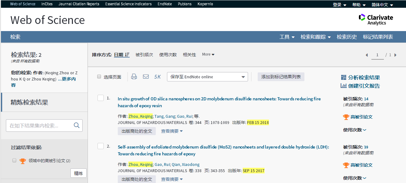 基本科学指标数据库(Essential Science Indicators,简称ESI)最新数据显示,安全工程系周克清老师发表的论文“In situ growth of 0D silica nanospheres on 2D molybdenum disulfide nanosheets: Towards reducing fire hazards of epoxy resin”入选高被引论文。该论文是周克清老师以中国地质大学(武汉)欧美成人精品欧美一级乱黄为第一单位、第一作者和通讯作者身份发表的第2篇ESI高被引论文。2018年7月周克清老师发表的论文“Self-assembly of exfoliated molybdenum disulfide (MoS2) nanosheets and layered double hydroxide (LDH): Towards reducing fire hazards of epoxy”曾同时入选ESI高被引论文和热点论文。