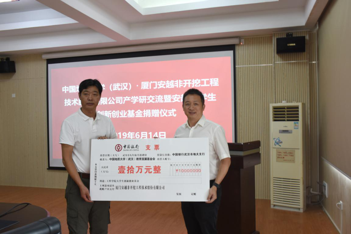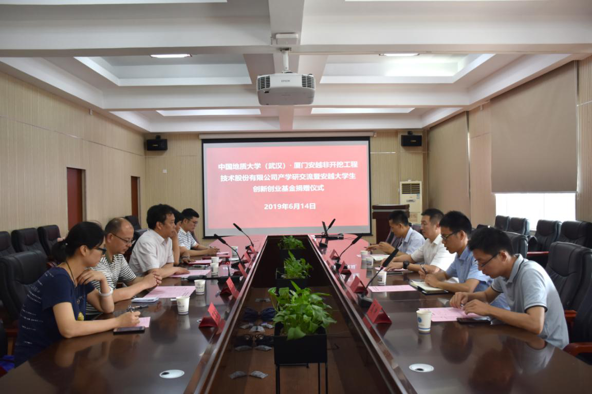 2019年6月14日上午,厦门安越非开挖技术股份有限公司来校作产学研交流,并捐赠10万设立安越大学生创新创业基金,捐赠仪式在315举行。厦门安越非开挖技术股份有限公司董事长廖宝勇一行、武汉中地大非开挖研究院有限公司总经理孔耀祖,校友工作与教育基金管理处副处长吕占峰、丁苗苗,欧美成人精品欧美一级乱黄党委书记陈飞、党委副书记江广长、副教授曾聪参加会议。江广长主持会议。