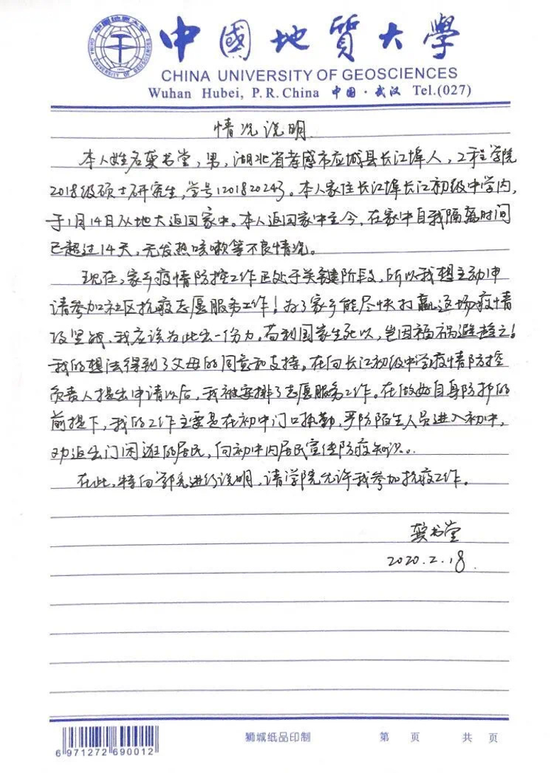 姚文昊 罗卓立 杨昊讯)龚书堂是我院2018级土木工程硕士研究生,他响应学院学校号召,担任抗击疫情一线的志愿者。