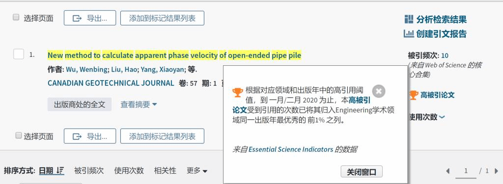 (通讯员:吴文兵、黄静)根据2020年5月基本科学指标数据库(Essential Science Indicators,简称ESI)最新数据显示,我院勘察与基础工程系吴文兵教授团队2020年在国际土木工程领域顶级期刊《Canadian Geotechnical Journal》 上发表的学术论文“New method to calculate apparent phase velocity of open-ended pipe pile” 入选ESI高被引论文(Highly Cited Paper)。