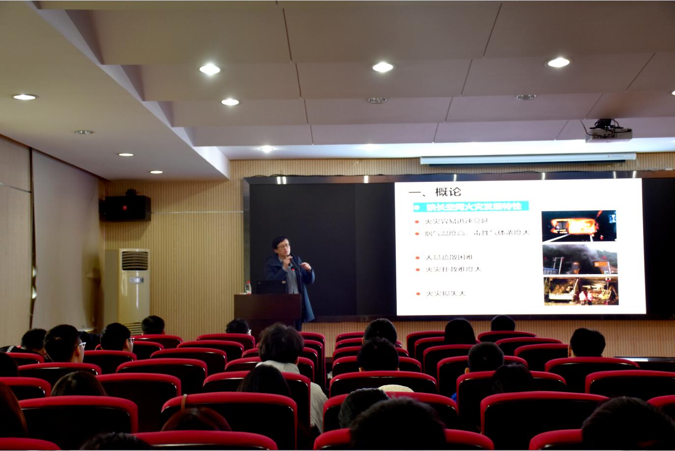 纪杰教授的报告围绕“狭长空间烟气流动特性及控制方法”开展。首先,他简述了狭长受限空间典型火灾案例与的分类,并重点讲解了隧道火灾这一典型狭长受限空间的主要研究方法。其次,基于近年来的研究,剖析了隧道火灾羽流与烟气蔓延行为、壁面的影响效应、火焰尺度、温度和有毒气体浓度的演化表征模型。此后,基于实际隧道的工程应用,对城市地下公路隧道自然排烟、机械排烟有效性、低压环境隧道烟气输运特征进行了详细介绍。最后,结合现阶段的研究,提出了基于数据同化的隧道火灾发展预测方法的前沿科学挑战。会后,纪杰教授与参会师生展开了隧道火灾学术交流,并由罗学东副院长对报告会进行了总结发言。