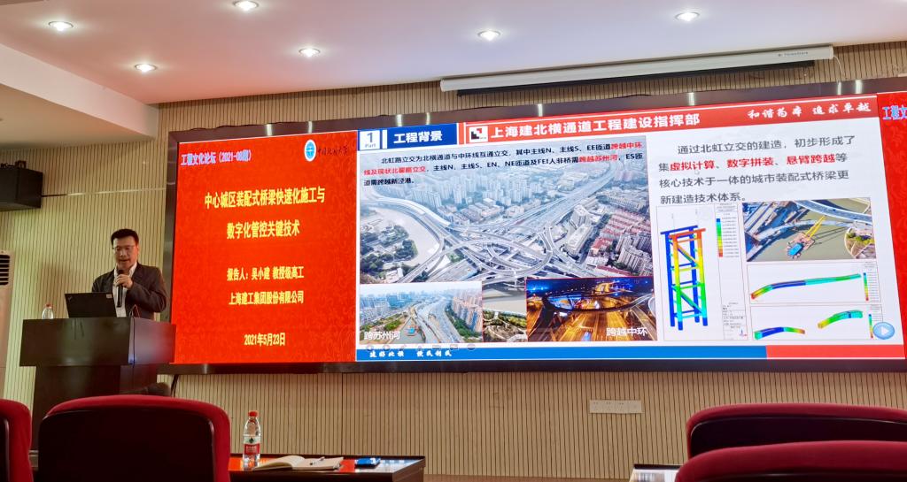 吴小建教高聚焦城市核心区施工面临的环境复杂、施工空间狭小、交通繁忙、建筑林立、管线密布和社会舆论影响大等重大难题,提出了中心城区转配式桥梁快速化施工和数字管控关键技术,介绍了城市核心区高架桥梁建设中全预制装配施工的新理念、既有桥梁结构全地形车整梁快速运移和拆除的新技术、适宜于狭小空间作业自行式大跨悬臂桥面吊装的新装备、“分段拼装、整体运移、整跨就位”的新工艺和集中化、数字化、智慧化、多层级综合管理的新决策平台。吴小建教高通过大量的视频案例全方位地展示了桥梁快速化施工和数字管控技术在上海核心城区的应用情况。会后,吴小建教高与参会师生进行了互动交流,现场气氛热烈。