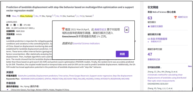 (通讯员:黄静)根据2021年7月基本科学指标数据库(Essential Science Indicators,简称ESI)最新数据显示,我院苗发盛副教授、吴益平教授团队于2018年在国际工程地质领域顶级期刊《Landslides》上发表的学术论文“Prediction of landslide displacement with step-like behavior based on multialgorithm optimization and a support vector regression model” 入选ESI高被引论文(Highly Cited Paper)。