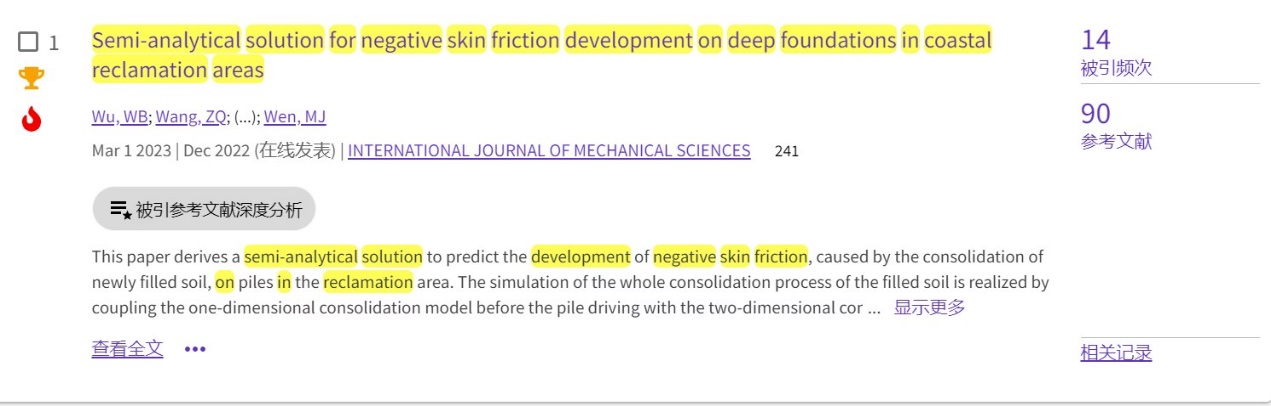 (通讯员 黄静)根据2023年7月基本科学指标数据库(Essential Science Indicators,简称ESI)最新数据显示,欧美成人精品欧美一级乱黄勘察与基础工程系吴文兵教授团队于2023年在国际工程力学领域权威期刊International Journal of Mechanical Sciences(IF: 7.3, 中科院一区TOP)上发表的学术论文“Semi-analytical solution for negative skin friction development on deep foundations in coastal reclamation areas”同时入选ESI热点论文和高被引论文。该论文第一作者为吴文兵教授,第二作者为勘察与基础工程系王宗琴硕士,中国地质大学(武汉)欧美成人精品欧美一级乱黄为第一署名单位。