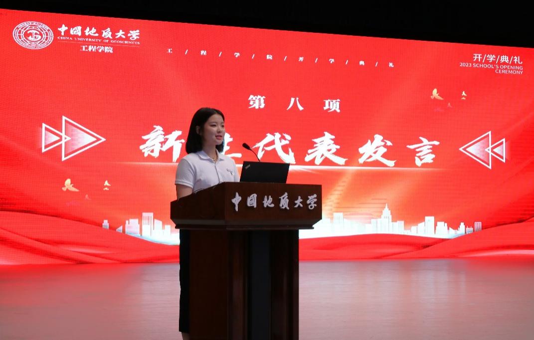 工程地质与岩土工程系教师吴琼作为教师代表发言。她以一名入学20年的“学姐”身份向各位新生分享自己的求学经历、教学经历、科研经历,从本科生到博士生,从硕士生导师到博士生导师,从职场小白到再取得一项项骄人的教学科研成果,风雨彩虹、铿锵玫瑰,她用自己的亲身经历书写着一名女性地质工程者向上攀登、步履不停的奋进史,为全体新生树立“真榜样”,帮助全体女生吃下学好工程专业的“定心丸”。吴琼老师寄语新生,要以理想者、担当者、吃苦者、奋斗者的姿态立足新时代、奋进新征程,创造新业绩、诠释正青春。