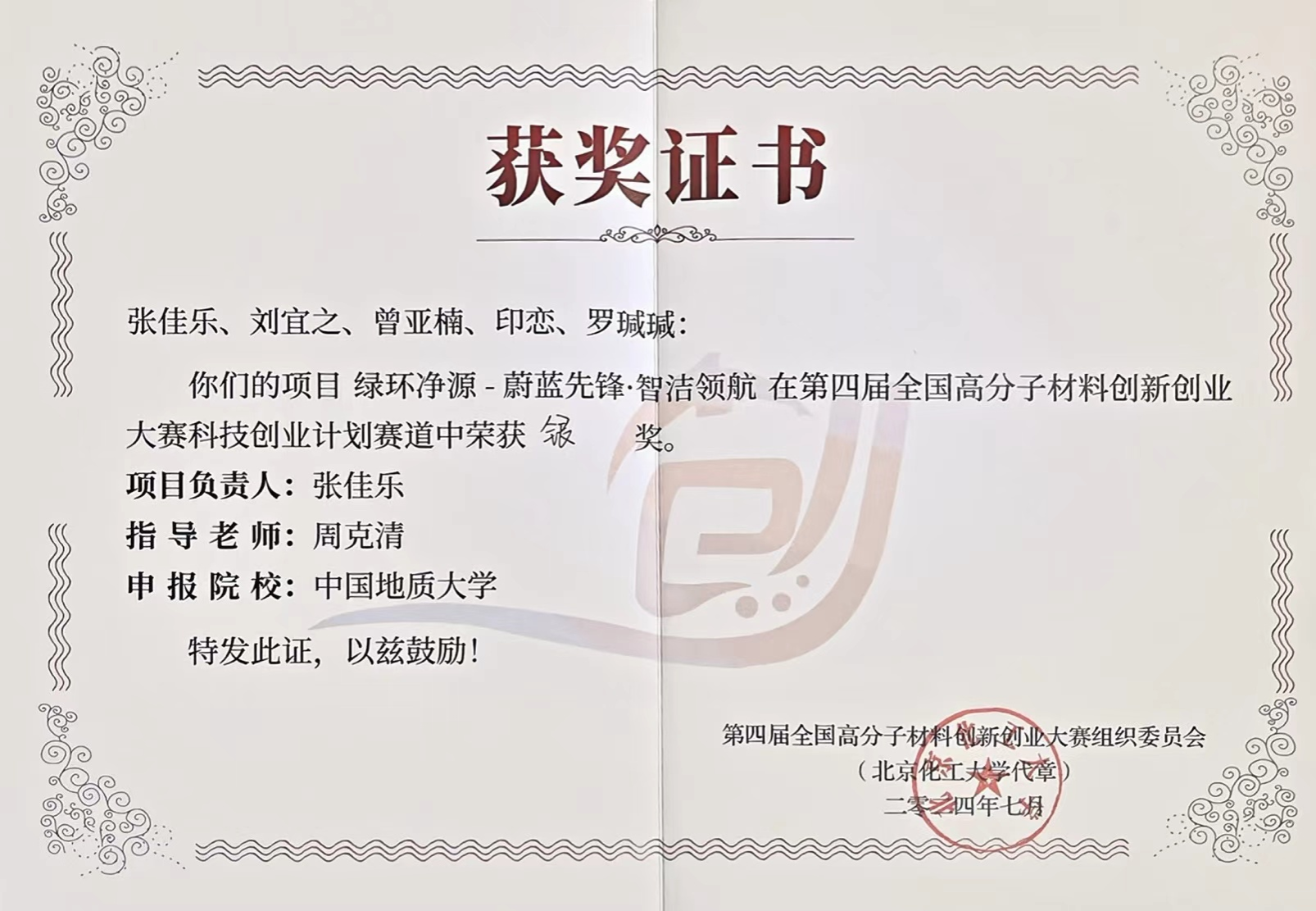 周克清特任教授指导的《绿环净源-蔚蓝先锋·智洁领航》项目荣获第四届全国高分子材料创新创业大赛科技创业计划赛道银奖。项目团队成员包括欧美成人精品欧美一级乱黄安全工程系本科生张佳乐、刘宜之、博士研究生生印恋、罗瑊瑊和马克思主义学院本科生曾亚楠。
