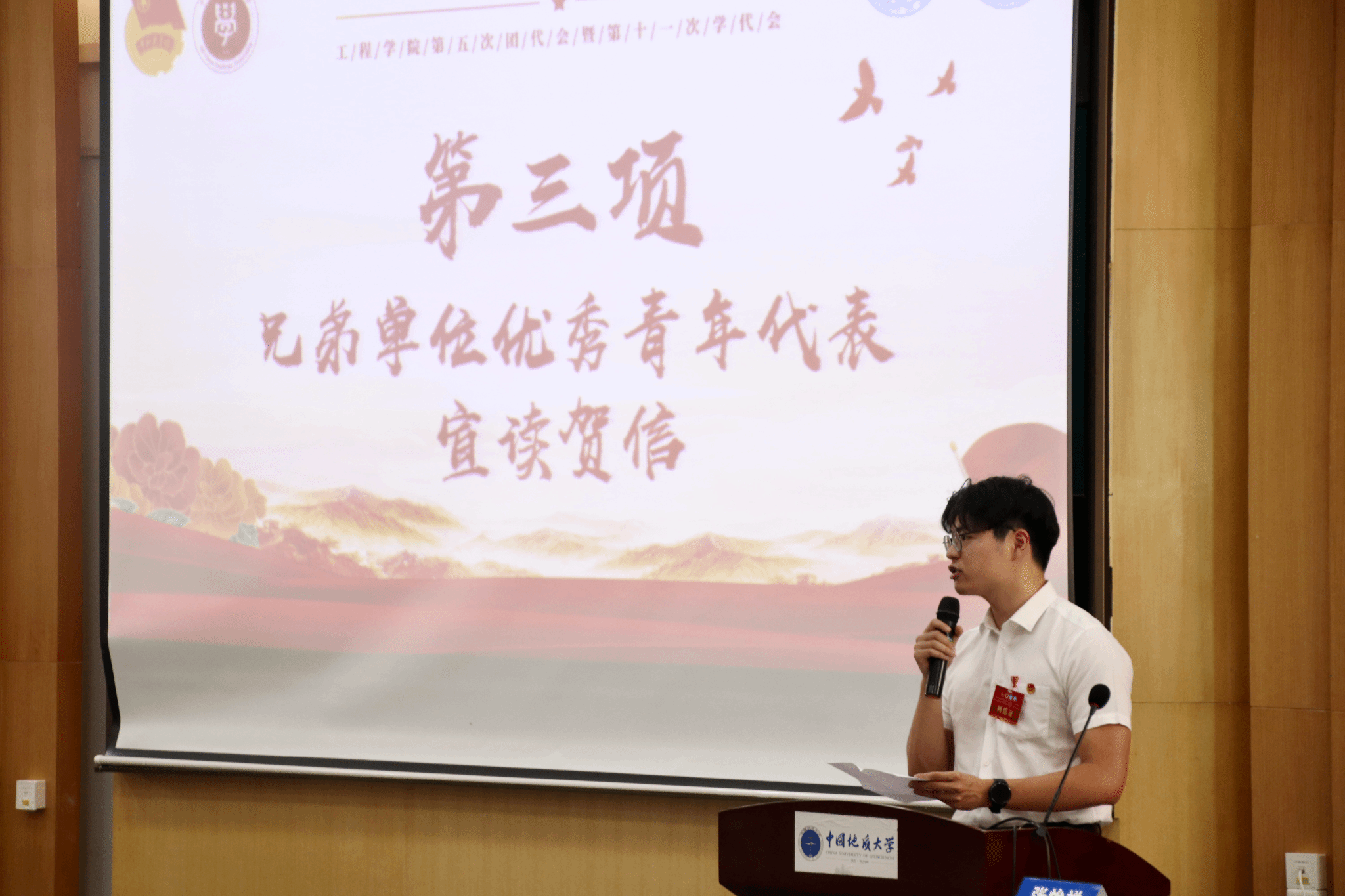 兄弟单位优秀青年代表华中农业大学工学院专职团干贾彦平和2024年全国“青马工程”班委、华中科技大学马克思主义学院硕士研究生张扬分别宣读贺信,贺信中饱含着兄弟院校对欧美成人精品欧美一级乱黄的美好祝愿与深厚情谊,彰显了青年一代团结奋进、携手共进的精神风貌。本次大会还收到了华中科技大学土木与水利欧美成人精品欧美一级乱黄、武汉理工大学土木工程与建筑学院等兄弟高校团委,以及中建三局基建投、武汉地铁集团和中交四航院研究院等企业团组织的贺信。